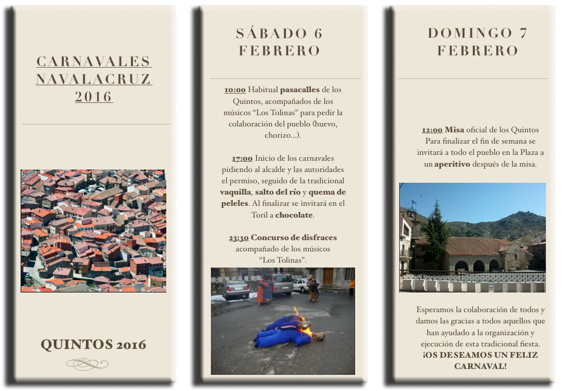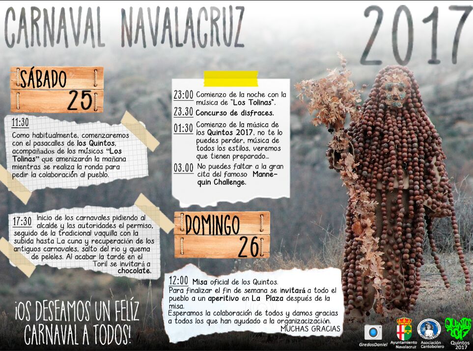 Busca en tu armario tu mejor disfraz y ven al pueblo a pasarlo bien con tus amigos de siempre.Intentaremos recuperar el Carnaval antiguo, trajes, máscaras, tradiciones, peronajes del carnaval con la ayuda de los Quintos de 2016.